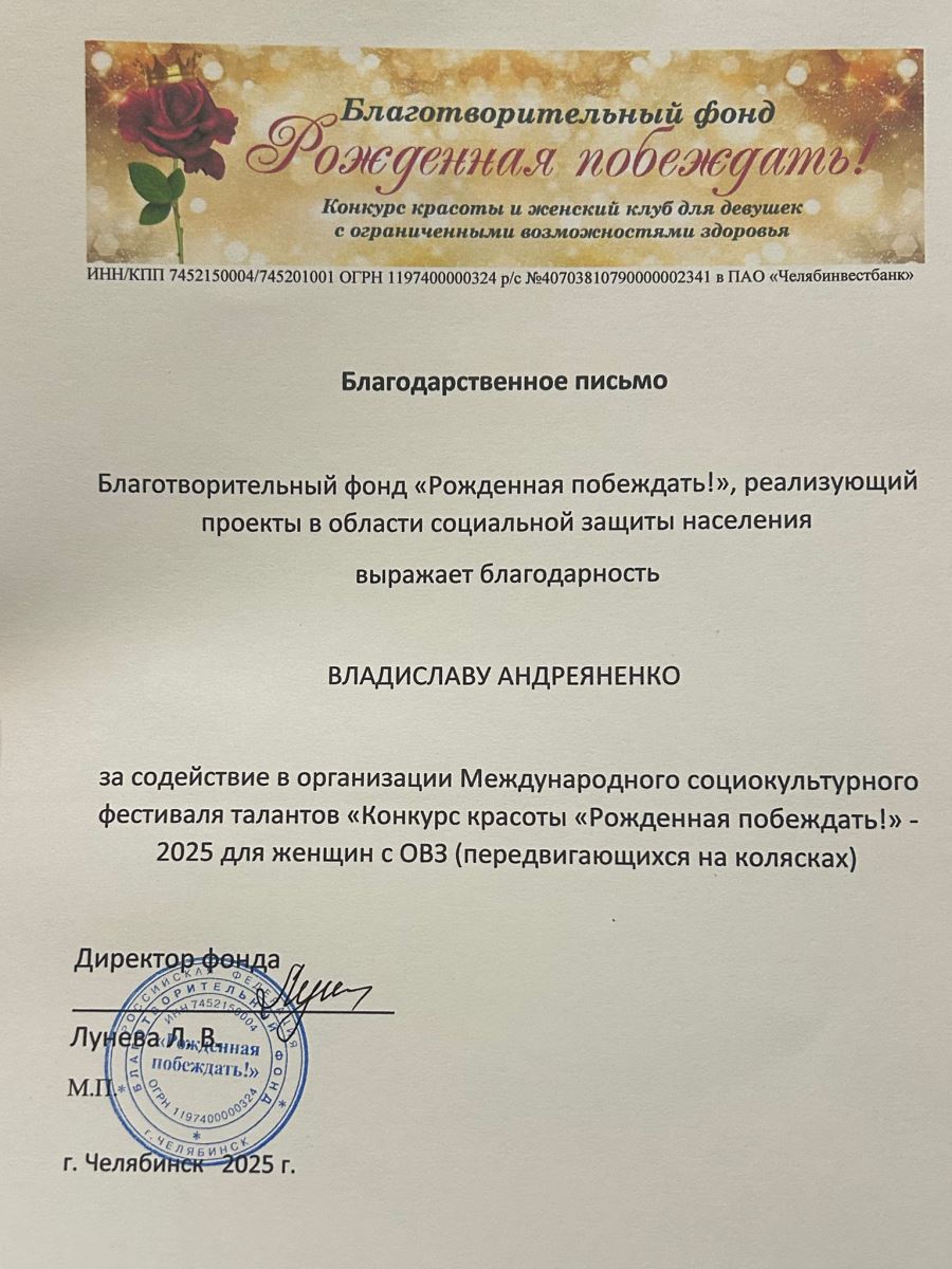 Педагог дополниртельного образования Андрияненко В.В. получил благодарственное письмо за содействие в организации Международного социокультурного фестиваля талантов "Конкурс красоты "Рожденная побеждать" для женщин с ОВЗ.
